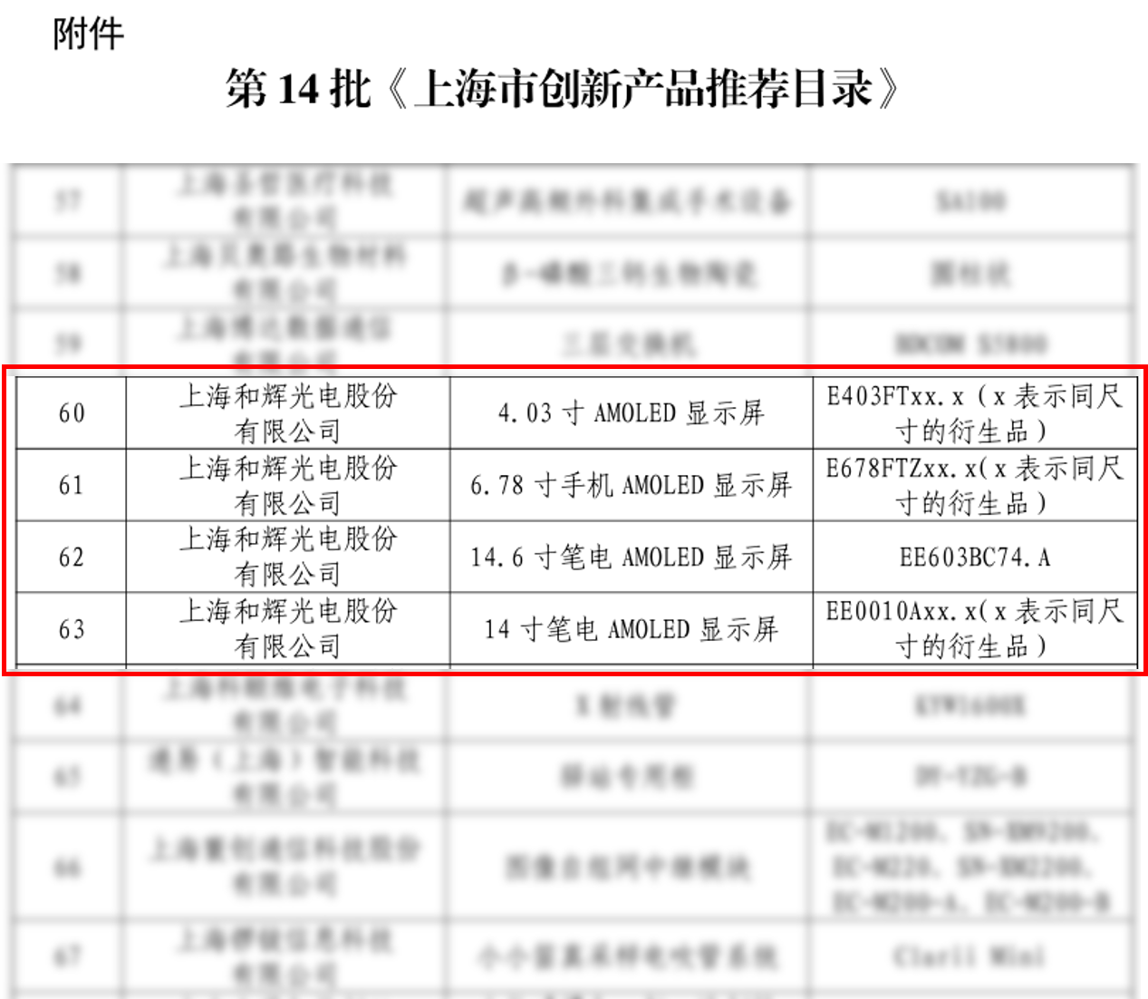 近日,上海市经济和信息化委员会公示第14批《上海市创新产品推荐目录》,和辉光电凭借持续的技术突破与扎实的产品创新成果,共有四款显示屏产品成功入选,分别为:4.03寸AMOLED显示屏、6.78寸手机AMOLED显示屏、14寸笔电AMOLED显示屏以及14.6寸笔电AMOLED显示屏。